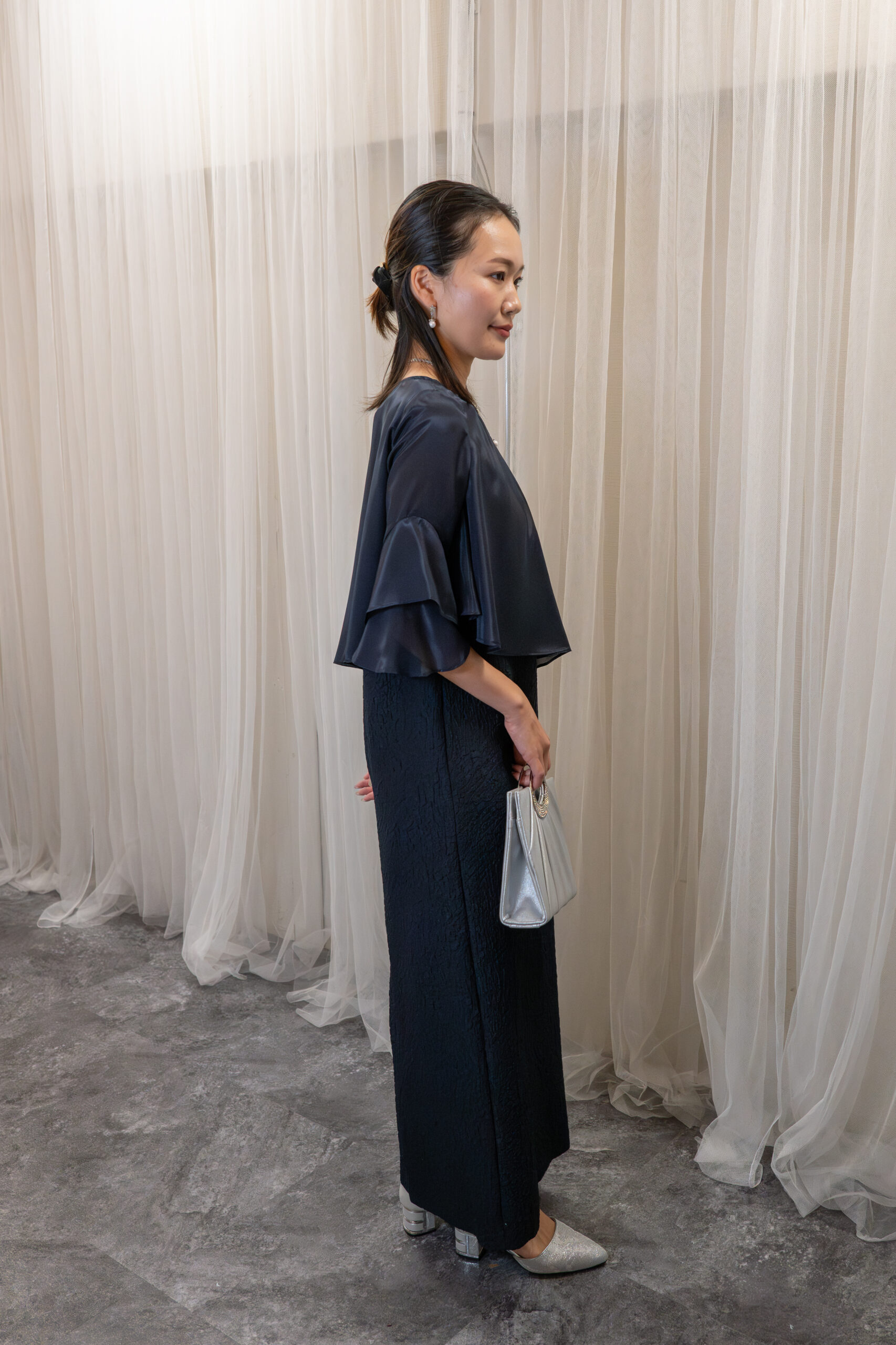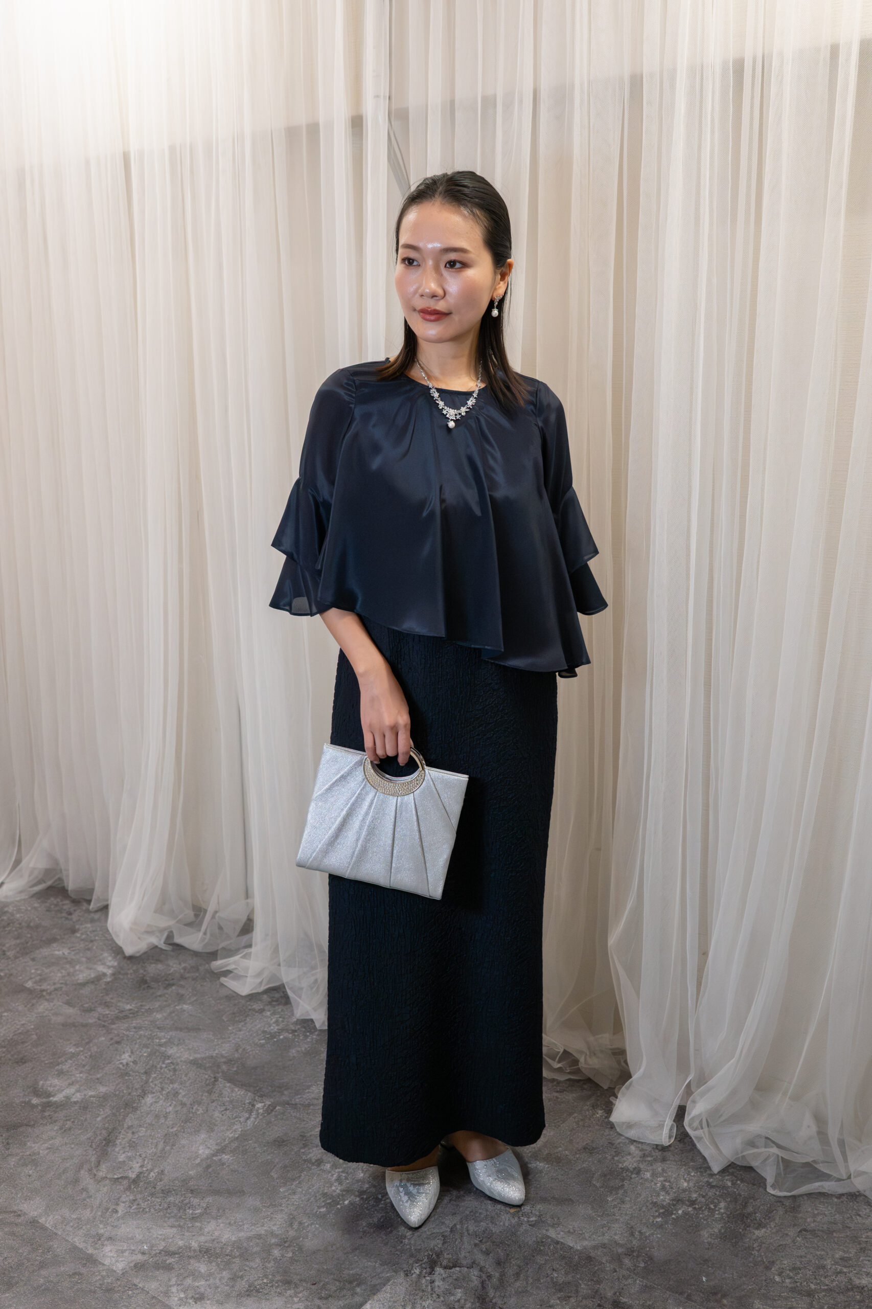 シンプルなシルエットのドレスに