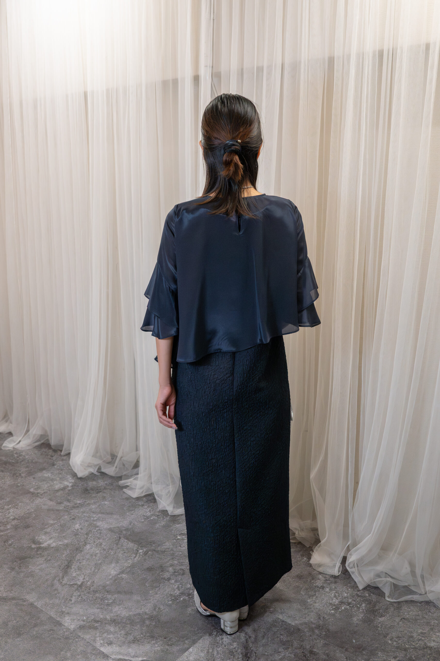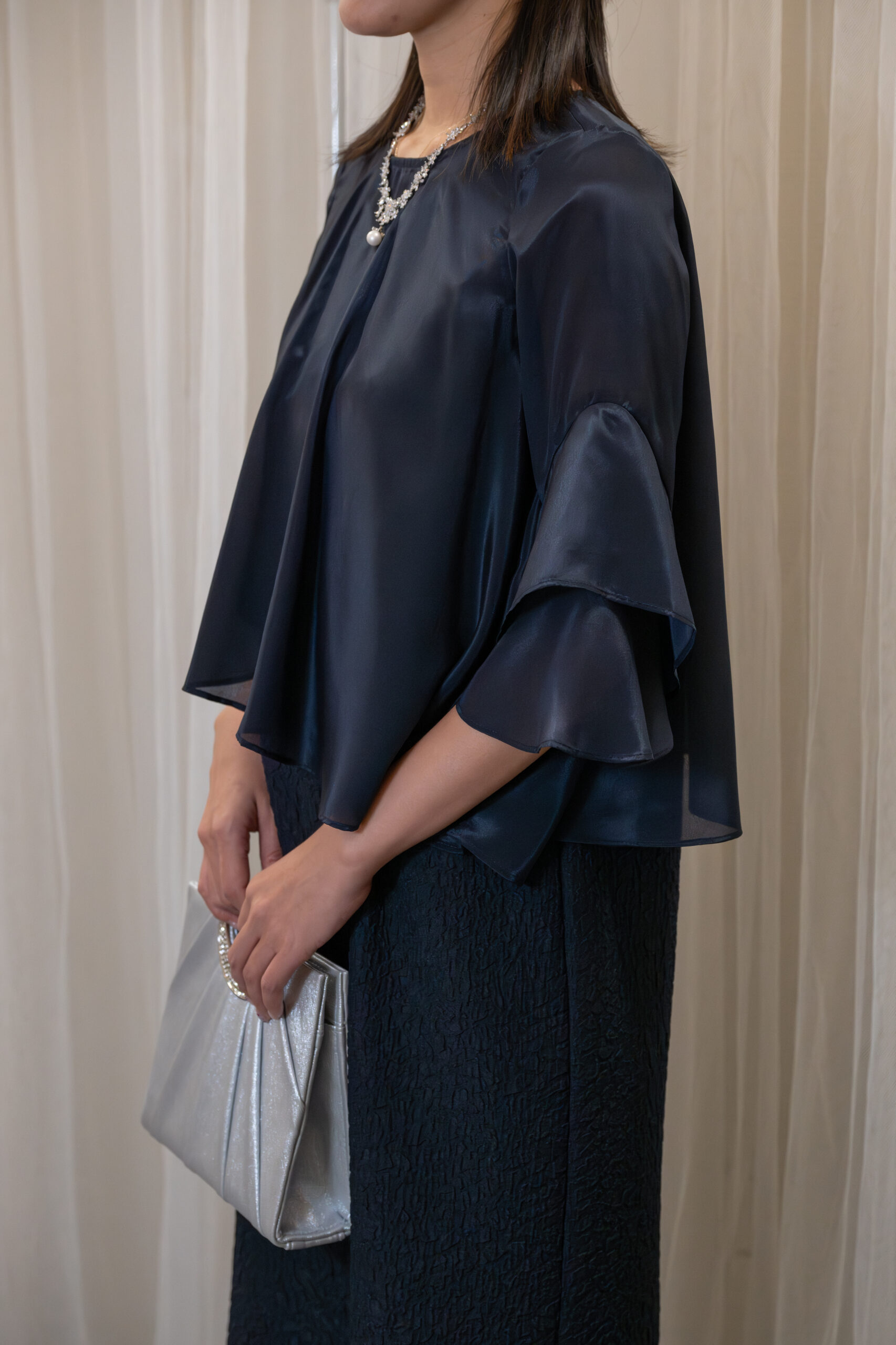 フレア袖のブラウスを重ねて