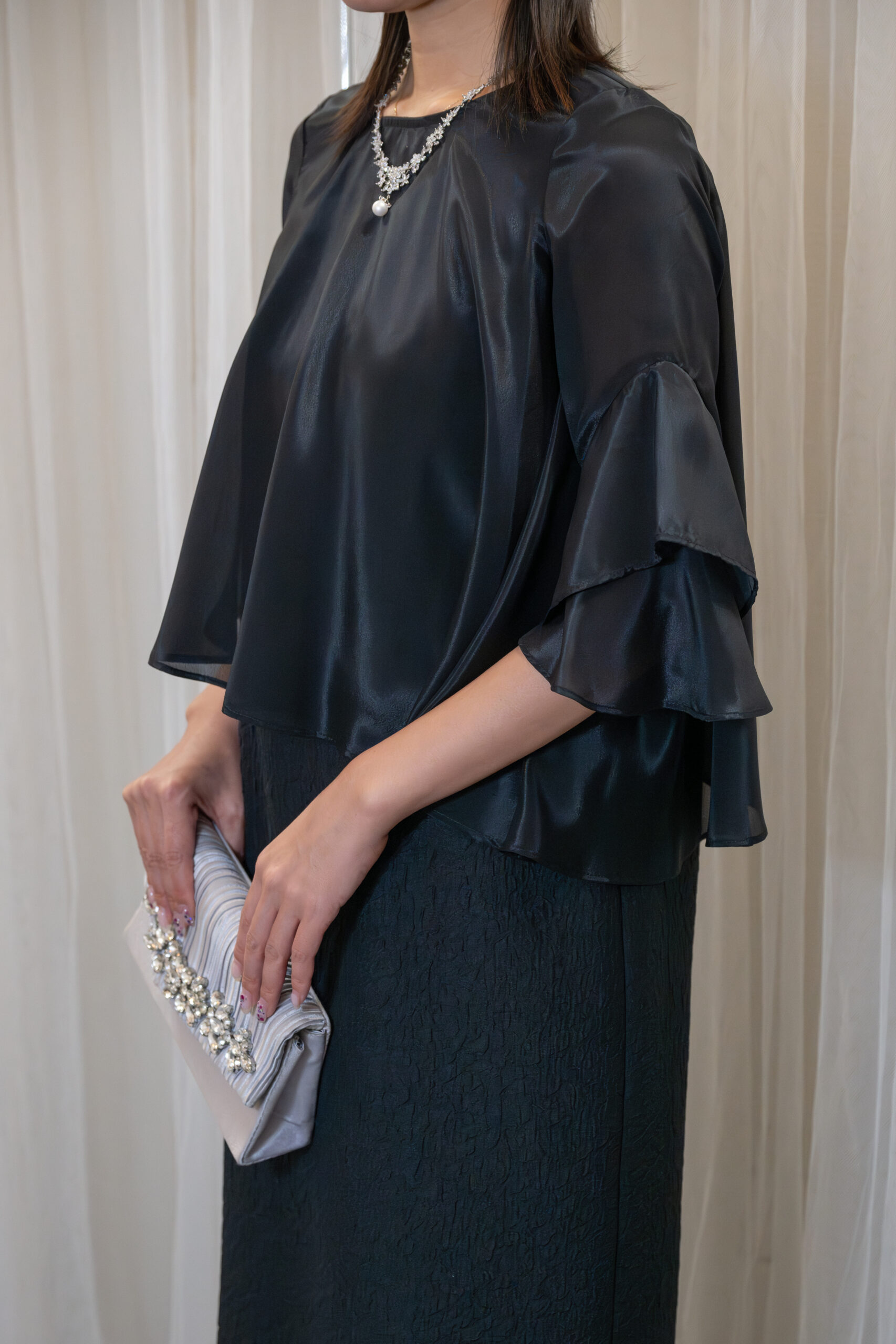フレア袖のブラウスを重ねて